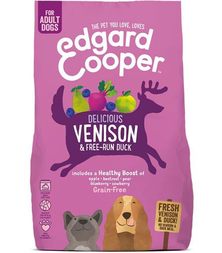 Edgard & Cooper Dog Grain Free Hjort & AndEdgard & Cooper Dog Grain Free Hjort & And er et fullfôr uten kornprodukter for voksne hunder. Det er laget av fersk and og ferskt hjortekjøtt, og inneholder ikke kjøttmel eller unødig fyllstoff.Fôret er beriket med blant annet eple, pære, rødbeter og blåbær som alle er gode og næringsrike ingredienser.Viktig:12 kg-posen inneholder større fôrkuler enn 7- og 2,5 kg-pose, for å passe best for større hunder!Bra å vite om varemerket:Edgard & Cooper satser mye på å bidra for miljøet, og på å forsøke å gjøre verden til et bedre sted for oss og dyrene våre. Utover dette er de selvsagt nøye med at deres godbiter og fôr holder høy kvalitet, ettersom bare det beste er godt nok for våre firbente venner.Fôr- og godisposene er produsert av plantemateriale og er komposterbare.Boksene er produsert av aluminium – et materiale som er lett å gjenvinne og som holder maten fersk lengeIngrediensene fraktes i kjølebiler som gjør at de ikke trenger å bli bearbeidet for å holde seg ferskeFôret bakes lenge på relativt lav temperatur, noe som gjør at næringsstoffer og smak holder seg godtEdgard & Cooper har en Zero Pawprint Plan som innebærer selskapets målsetting om å bidra positivt for miljøet innen 20251 % av salget går til veldedige formål – til hunder og katter som har det vanskelig i ulike deler av verden ...