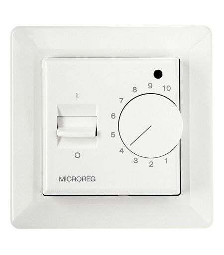 Micro Matic Effektregulator MRC-1000H MICROREG er en fullelektronisk effektregulator for trinnløs regulering av elektriske varmeanlegg opptil 1000W. MICROREG regulerer etter tidsproporsjonalprinsippet med syklustid på ca. 10 sekunder. Dette betyr at varmeelementet slås av og på i et puls/pauseforhold, som gjør at den tilførte middeleffekt kan tilpasses det aktuelle varmebehov. Inn- og utkopling styres av en triac som “tenner” i nullpunktet på sinuskurven. Dette for å unngå radiostøy. Det ønskede puls/pauseforholdet kan trinnløst stilles fra 0 til 10. Dvs. at i stilling 5 vil varmeelementet være innkoplet i ca. 5 sekunder og utkoplet i ca. 5 sekunder. Innstillingsområdet kan begrenses eller fastlåses ved hjelp av den røde og blå ringen under innstillingsknappen. MRC-100H er tilpasset standard veggboks og passer bl.a. inn i Giras System 55 rammer, RS-16 og UNI-systemene. – Ved montering på vegg må påveggskappe MTC-VH bestilles – Deksel som hindrer uønsket betjening kan bestilles. ...