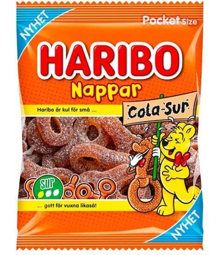 Det første produktet som lanserte i Sverige 1961 var Napparna och de ble et synonym for varemerket HARIBO. Kanske er det också den lekfulla formen och de lekre smakerne som har hjelpt til å gjøre dem til favoritt. Cola er nummer en av de største smakerne.Se relaterte produkter for vårt utvalg av Malaco, Haribo & Ahlgrens Biler.Ingredienser: Glukossirap; socker; gelatin; druvsocker; syror: citronsyra, äppelsyra; surhetsreglerande medel: calciumcitrat, natriumvätemalat; arom; ytbehandlingsmedel: karnaubavax. Skyddas mot värme och fukt.Næringsinnhold Per 100 g:Energi 1463 (kJ)Energi 345 (kcal)Fett 0 g / hvorav mettede fettsyrer 0 gKarbohydrater 80 g Hvorav sokkerarter 49 g Protein 5.0 g Salt 0.01 g ...