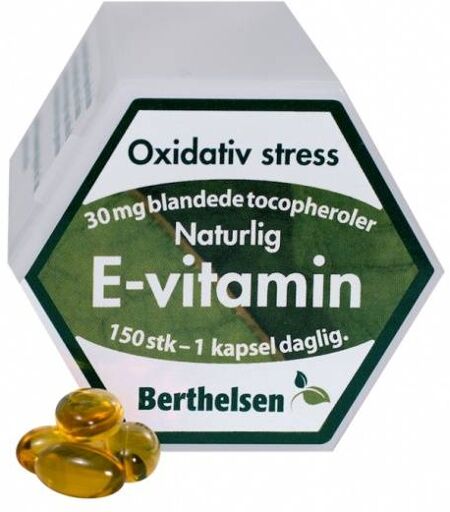 E-vitamin er en antioksidant, som sikrer cellemembranenes stabilitet. Vitamin E bygger et ”skjold” omkring cellen og beskytter den mot angrep fra frie radikaler. Frie radikaler er skadelige restprodukter fra stoffskifteprosessene som konstant pågår i kroppen vår. Derfor er det viktig å få tilført tilstrekkelig med antioksidanter – som vitamin E – for å beskytte cellene i kroppen.Vitamin E er et fettløselig vitamin. E-vitamin fungerer også som en aktioksidant som beskytter maten vår mot oksidasjon fra frie radikaler. I vegetabilske oljer følges det høye innholdet av flerumettede fettsyrer av et like høyt innhold av E-vitamin.Berthelsen Naturlig E-vitamin er et lettopptakelig E-vitamin tilskudd som inneholder blandede tokoferoler (naturlig E-vitamin) og hvetekimolje. Ingredienser:Hvetekimolje, overflatebehandlingsmidler (gelatin, glyserol), tokoferolrik ekstrakt (d-alfa-tokoferol, d-beta-tokoferol, d-delta-tokoferol, d-gamma-tokoferol). Bruksveiledning:Normal dosering er 1 kapsel daglig. Innhold: 150 kapsler ...