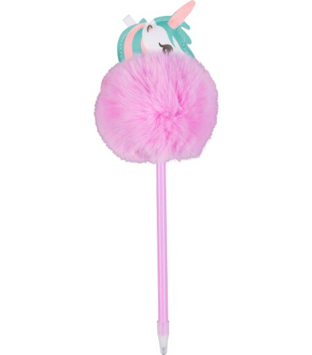 Fargerik kulepenn for barn toppet med pompong i fuskepels og enhjørning i skinn. Teksten er maskinoversatt. ...