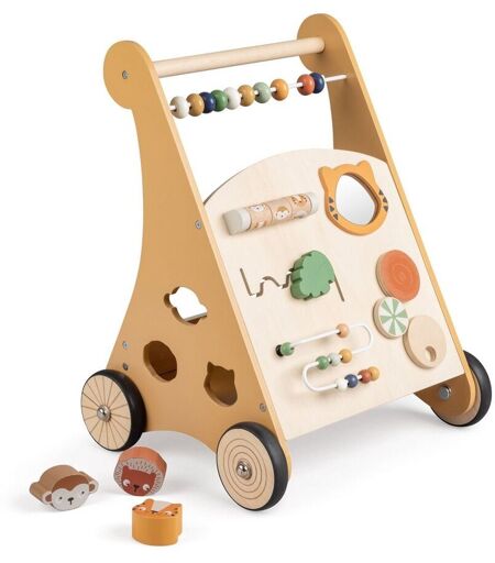 Aktivitetsgåvogn i tre med speil, puttekasse og lekefunksjoner som støtter barnets første skritt og stimulerer sanser og motorikk. En stor og fin trele ...