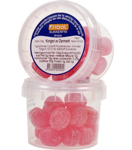 Fribol sukkerfrie drops Kongen av Danmark er drops med velsmakende anissmak. Dropsene er sukkerfrie og søtet med sukralose som ikke lager hull i tennene. Fribol Kongen av Danmark drops har en svært lav Glykemisk Indeks og påvirker derfor ikke blodsukkeret. Produktet egner seg derfor godt til diabetikere. Inneholder ikke gluten og kan brukes av personer med glutenintoleranse. Fribol Kongen av Danmark Drops inneholder kun 1 kcal pr. gram og er derfor velegnet for alle som ønsker å begrense kaloriinntaket. ...