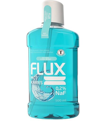 Flux Fluorskyll 0,2 % Original er et munnskyll som bidrar til å styrke tannoverflaten og gi sterke tenner, med smak av coolmint. Flux Fluorskyll 0,2 % Original er et munnskyll med fluor som bidrar til å forebygge hull i tennene. For best effekt anbefales det å skylle med 10 ml 1–2 ganger om dagen, som et supplement til tannpuss med fluortannkrem. Munnskyllet inneholder 0,2 % natriumfluorid (2 mg/ml = 910 ppm F). Flasken har en praktisk doseringspumpe slik at man får en perfekt dose hver gang. Med en frisk smak av coolmint. Til voksne og barn over 12 år. Vegansk. Uten alkohol. ...