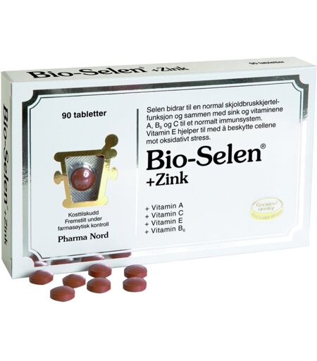 Pharma Nord Bio-selen+sink tabletter er et kosttilskudd som inneholder et antioksidantkompleks med viktige mineraler og vitaminer. Pharma Nord Bio-Selen+Zink er et kompleks med rent, økologisk selen og sink samt vitamin A, C, E og B6, som alle har egenskaper som medvirker til beskyttelse av DNA, proteiner og fettstoffer mot oksidative skader fra frie radikaler. Mineral- og vitamintilskuddet inneholder 100 mikrogram selen i form av Pharma Nords patenterte og økologiske selengjær, SelenoPrecise, som igjen inneholder 66 % selenometionin og 34 % andre forskjellige former av selen. Denne blandingen tilsvarer selenformene vi får i oss om vi spiser en kost rik på selen. Antioksidantene selen, sink, vitamin C og E støtter, beskytter og komplementerer hverandre. Bio-Selen+Zink bidrar til å opprettholde et normalt immunforsvar, medvirker til vedlikehold av hår og negler samt bidrar til å beskytte cellene mot oksidativt stress og til å vedlikeholde et normalt syn. ...