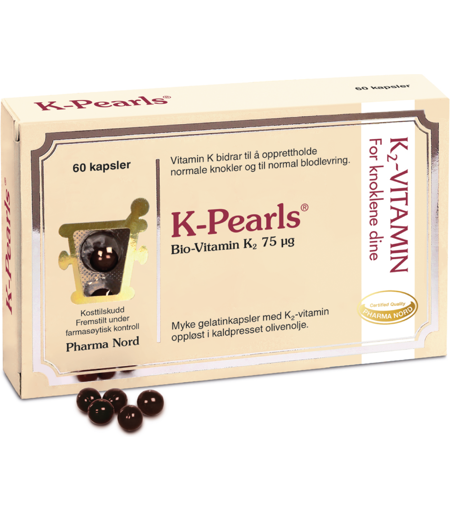 K-Pearls 75µg er et kosttilskudd som bidrar til å opprettholde normale knokler og blodlevring. K-Pearls er små, myke gelatinkapsler, som inneholder 75 µg ren vitamin K2 (menakinon MK-7) i hver kapsel. Vitamin K bidrar til å opprettholde normale knokler og normal blodlevring. K2-vitaminet er oppløst i kaldpresset olivenolje for å forbedre opptaket, da vitamin K er fettløselig. Kapslene er små så du kan enkelt svelge dem, alternativt kan de også tygges. Kosttilskuddet er produsert under farmasøytisk kontroll i Danmark. ...