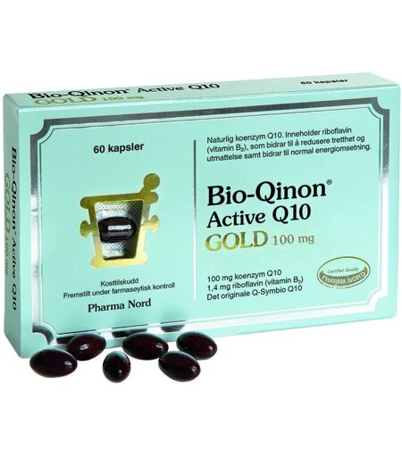 Pharma Nord Bio-Qinon Q10 GOLD 100 mg kapsler er et kosttilskudd med koenzym Q10 og vitamin B2 (riboflavin), til voksne over 18 år. Pharma Nord Bio-Qinon Q10 GOLD 100 mg kapsler inneholder en unik blanding av vegetabilsk olje og koenzym Q10, som gir en god biotilgjengelighet. Inneholder rent koenzym Q10 som ubiqinon, og vitamin B2 som bidrar til å redusere tretthet og utmattelse samt bidrar til normal energiomsetning. Q10 er en viktig komponent i kroppens energiomsetning. Allergen: soya. Til voksne over 18 år. ...