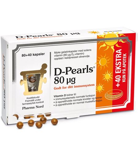 Pharma Nord D-Pearls 80 µg kapsler er et kosttilskudd med vitamin D3, til voksne over 18 år. Pharma Nord D-Pearls 80 µg kapsler er bløte gelatinkapsler med 80 mikrogram D3-vitamin i hver kapsel. D-vitamin bidrar til et normalt immunforsvar, til vedlikehold av normale knokler og tenner og bidrar til vedlikehold av en normal muskelfunksjon. D-vitamin er også viktig for opptaket av kalsium og understøtter normal celledeling. D-vitaminet er oppløst i kaldpresset olivenolje og innkapslet i små perler. Størrelsen gjør de lette å svelge. Kan også tygges. Til voksne over 18 år. Gelatinen i kapslene er halal- og koshersertifisert. Gluten-, sitrus- og laktosefri. ...