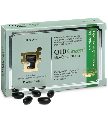 Q10 Green Bio Qinon 100 mg er Q10 i plantebaserte kapsel. Q10 Green Bio Qinon består av myke vegetabilske kapsler med 100 mg aktiv ubiqinon løst i vegetabilsk olje. Kapslene i Q10 Green er Pharma Nords egenutviklede og varemerkeregistrerte phytokapsler, fremstilt av danske råvarer som poteter, erter og GMO-fri mais, som fermenteres. Innholdet er produsert etter samme patenterte fremstillingsmetode som Bio-Qinon Active Q10 Gold noe som sikrer høy kvalitet og effekt. For å beskytte kapslens innhold mot lys er det valgt en blanding av fettredusert kakaopulver, rødbetepulver og grønn te. Produsert under farmasøytisk kontroll på Pharma Nords fabrikk i Danmark. Beregnet for voksne over 18 år. ...