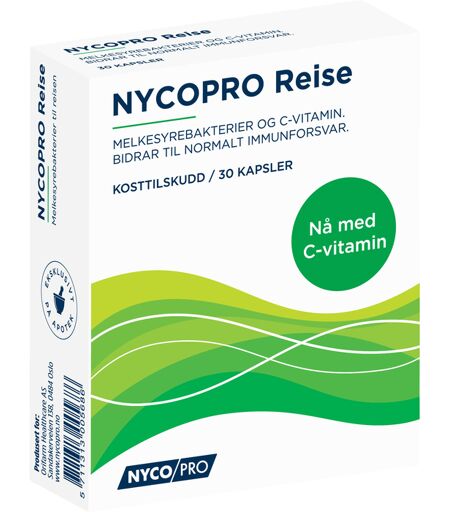 Nycopro Reise kapsler er et kosttilskudd med probiotika og vitamin C til deg som skal ut og reise, 30 kapsler. Løs mage og mageproblemer er aldri gøy, spesielt ikke på ferie. Nycopro Reise er et kosttilskudd med melkesyrebakterier og vitamin C, spesielt tilpasset deg som planlegger en utenlandstur om ikke så altfor lenge. Hver kapsel inneholder 8 milliarder melkesyrebakterier fra 10 spesielt utvalgte bakteriestammer, som sammen kan bidra til å opprettholde normal mage-tarmfunksjon på reisen og under ferien. I tillegg inneholder kosttilskuddet C-vitamin (12 mg per kapsel) som bidrar til å opprettholde et normalt immunforsvar. Til voksne og barn fra 3 år oppover (fra 1 år i samråd med helsepersonell). Uten gelatin, gluten og sitrus. Kan inneholde spor av melk. ...