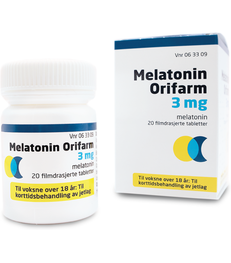 Melatonin Orifarm 3 mg tabletter er et reseptfritt legemiddel til korttidsbehandling av jetlag hos voksne over 18 år. Melatonin Orifarm 3 mg tabletter inneholder virkestoffet melatonin som synkroniserer kroppens biologiske døgnrytme. Kan brukes mot søvnvansker som oppstår etter tidsforskjell når man reiser over flere tidssoner. Til voksne over 18 år. Følg anbefalt dosering. Les pakningsvedlegget før bruk. ...