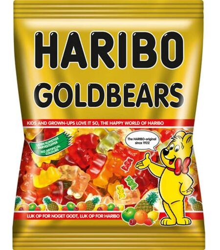 Haribo Gullbjørner 80gram pr pose.Se relaterte produkter for vårt utvalg av Malaco, Haribo & Ahlgrens Biler.Ingredienser: Glukosesirup ; sukker; gelatin; glukose; fruktjuice fra konsentrat: eple, jordbær, bringebær, appelsin, sitron, ananas; syre: sitronsyre; frukt- og plantekonsentrat: saflor, spirulina, eple, hyllebær, appelsin, solbær, kiwi, sitron, aronia, mango, pasjonsfrukt, drue; aroma; hyllebær ekstrakt; palmeolje: overflatebehandlingsmiddel: bivoks hvitt og gult, carnauba voks.Næringsinnhold Per 100 g:Energi 1459 (kJ)Energi 343 (kcal)Fett 0.5 g / hvorav mettede fettsyrer 0.1 gKarbohydrater 77 g Hvorav sokkerarter 46 g Protein 6.9 g Salt 0.07 g ...