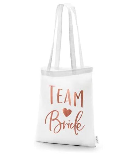 Elegant og praktisk tote bag i hvit bomull med teksten Team Bride i skinnende rosegull. Perfekt til utdrikningslag eller bryllupshelg for brudens følgesvenner. Romslig størrelse som passer til alt du trenger på dagen. ...