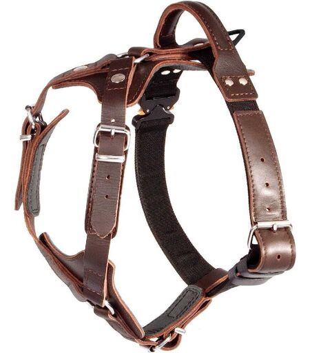 Dingo Gear AMOS Cobra System Hundesele i lær - BrunSterk og multifunksjonell sele fra Dingo Gear laget av naturskinn som gir god bevegelsesfrihet. Med godt justert utstyr føler ikke hunden noe trykk, og belastningen fordeles jevnt. Selen sørger for full komfort og sikkerhet for firbeinte venner. En sterk COBRA-spenne fra det anerkjente østerrikske selskapet AUSTRIALPIN (som brukes av fjellklatrere) garanterer pålitelig bruk. Selen kan brukes både på tur, patruljering og trening. Selene er testet av trenere ved profesjonelle treningssentre i Europa, og Dingo Gear har laget dem for hånd med stor omhu fordi de vet hvor viktig holdbarhet er under bruk! Stropper i naturskinnJusterbare... ...
