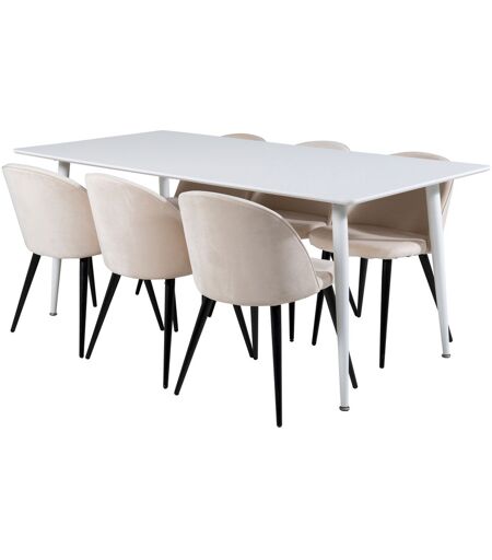 Polar180X90WHWH spisegruppe spisebord hvit og 6 Velvet spisestuestoler velour beige, svart.