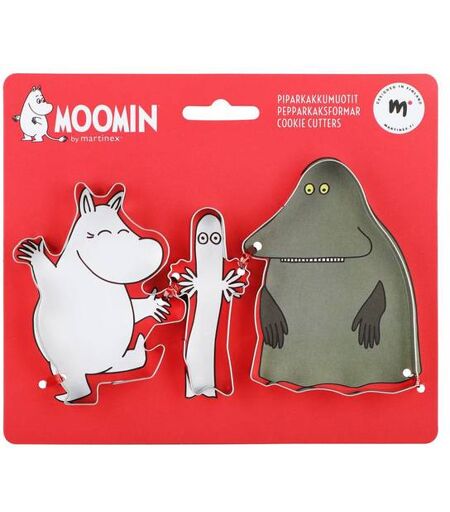 Et sett pepperkakeformer i rustfritt stål, formet som Mumintrollet, en Hattifnatt og Hufsa.Formene er ca. 7,5 cm høy. Perfekt som gave!Anbefaler håndvask. ...