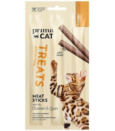 PrimaCat Meat Stick Chicken & Liver 3x5 g Her har du en praktisk 3-pakning med myke godbitpinner som vi tror katten din vil elske! Du kan gi pusen en hel godbitpinne for å holde den sysselsatt en liten stund, eller du kan bryte pinnen i småbiter og gi den litt av gangen. Godbitpinnene har en deilig smak av kylling og lever, og de inneholder verken korn eller tilsatt sukker. Husk at snacks aldri er et alternativ til et balansert kosthold – det skal alltid gis ved siden av som en bonus eller belønning. Uansett hvor glad din firbeinte venn er i godbiter, er det du som eier som er ansvarlig for at den holder seg frisk og rask. Les anbefalingene på forpakningen, og husk at alle dyr er individer – tilpass inntaket etter hva som passer nettopp din venn! ...