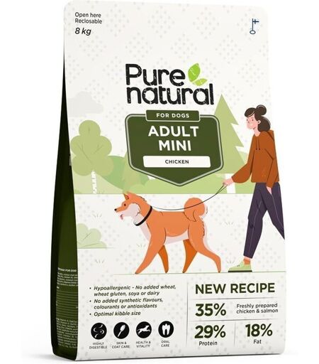 Purenatural Dog Adult Mini Chicken – Tørrfôr for små hunderaser! Dette er et komplett fôr spesielt utformet for voksne hunder av små raser. Tørrfôret består av små fôrkuler med kylling som viktigste proteinkilde. Fôret er tilpasset for voksne hunder opptil 10 kg. Du kan gi fôret fra 1 års alderen inntil det er tid for å starte med seniorfôr rundt 8 års alderen. Purenatural Dog Adult Mini Chicken – Nydelig, komplett fôr for liten hund Fôret inneholder et høyt kjøttinnhold og er rikt på vitaminer og mineraler for å fremme hundens allmennhelse og vitalitet. Protein- og fettinnholdet er nøye avveid for små hunder.Fôret er også beriket med FOS og MOS som fremmer tarmhelsen og fordøyelsen. I tillegg inneholder maten omega-3 og omega-6 som støtter en frisk og sunn hud og pels. Purenatural Dog Adult Mini Chicken er fri for hvete, soya og melkeprodukter som kan forårsake overfølsomhet hos mange hunder. Fôret har et lavt innhold av korn og inneholder ingen kunstige farge- eller smaksstoffer samt konserveringsmidler. Komplett fôr for voksne hunder opptil 10 kg Høyt kjøttinnhold med kyling som viktigste proteinkilde Fremmer tarmhelsen og fordøyelsen Passer hunder med sensitiv mage Dette er en ny versjon av Purenatural Dog Adult Mini Chicken. Komplett fôr kommer i et nytt herlig design og inneholder fersk laks fra Norden. Den nye oppskriften inneholder ikke lenger ørret og maisgluten. Størrelsen på fôrkulene er den samme, mens fargen og formen skiller seg fra den tidligere versjonen. ...