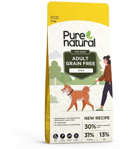 Purenatural Dog Adult Grain Free Duck – Kornfritt fôr med and! Dette er et kornfritt fôr med god og smaksrik and. Tørrfôret er lettfordøyelig og passer for voksne hunder i alle raser og størrelser. Dette nydelige fôret har et høyt proteininnhold og inneholder kun and som animalsk proteinkilde. Tørrfôret er dermed hypoallergent og egner seg for hunder med overfølsomhet. Anden bidrar også med jern, selen, sink og vitamin B! Purenatural Dog Adult Grain Free Duck er fri for kunstige smaksstoffer og konserveringsmidler. Det kornfrie fôret støtter hundens munnhelse og fordøyelsen samt styrker hundens pels og hud. Purenatural Dog Adult Grain Free Duck – for hunder i alle størrelser! Kornfritt fôr for voksne hunder Med and som eneste animalske produkt Inneholder viktige vitaminer og mineraler Passer for hunder med sensitiv mage Dette er en ny versjon av Purenatural Dog Adult Grain Free Duck. Den nye oppskriften har noen oppdateringer, blant annet er søtpoteten byttet ut med vanlig potet. Størrelsen på fôrkulene er den samme, mens fargen og formen kan være annerledes. ...