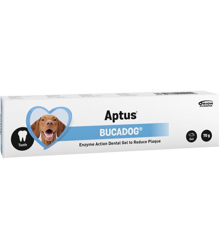 Aptus Bucadog Gel er en tanngel til hund, som hemmer unormal bakterievekst og dannelse av plakk. Aptus Bucadog Gel inneholder flere ulike enzymer som sammen med spyttet hemmer unormal bakterievekst og dermed dannelse av plakk. Dette reduseres risikoen for tannstein, og resultatet blir sunnere tenner og tannkjøtt. Ved å hemme bakterieveksten i munnen får hunden også en friskere ånde. Tanngelen brukes daglig, helst etter tannpuss. Regelmessig tannpuss er det beste bidraget til en sunn munnhygiene. Dårlig ånde sammen med blødende tannkjøtt kan indikere problemer i munnhulen som plakk og tannstein. Dette kan igjen føre til løse tenner. Kontakt alltid veterinær hvis du er usikker på hundens helse. Pakken inneholder én tube med tanngel à 70 gram og applikator. Aptus mener at alle kjæledyr har rett til et lykkelig liv med god helse. Derfor har de utviklet produkter av høy kvalitet som dekker en rekke behov innen dyrepleie. Produktene til katt og hund omfatter kategoriene alminnelig helse, fordøyelse, hud/pels, leddhelse og munnhygiene. ...