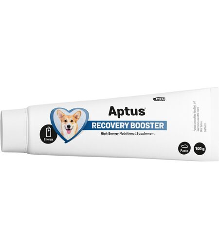 Aptus Recovery Booster Dog er et energitilskudd og næringstilskudd til hund. Aptus Recovery Booster Dog er et fôrtilskudd som inneholder essensielle aminosyrer, essensielle fettsyrer og viktige vitaminer. Tilskuddsfôret kan erstatte fôret i kortere perioder eller brukes som tilskudd ved nedsatt appetitt. Pastaen inneholder aminosyrene tyrosin, glutamin, arginin og fenylalanin, betaglukaner, vitamin C og B6 samt mineralene selen og magnesium. Det høye energiinnholdet tilføres i form av oliven- og lakseolje og kan dekke det daglige kaloribehovet. Fortilskuddet brukes ved nedsatt appetitt, ved rekonvalesens og etter operasjoner, skader eller sykdom samt til hunder med høyt aktivitetsnivå, f.eks. jakthunder, redningshunder og agilityhunder. Pakken inneholder én tube à 100 gram. NB! Kontakt veterinær før du gir Recovery Booster til drektige tisper, valper yngre enn 4 måneder eller til hunder med lever- eller nyreproblemer. Aptus mener at alle kjæledyr har rett til et lykkelig liv med god helse. Derfor har de utviklet produkter av høy kvalitet som dekker en rekke behov innen dyrepleie. Produktene til katt og hund omfatter kategoriene alminnelig helse, fordøyelse, hud/pels, leddhelse og munnhygiene. ...