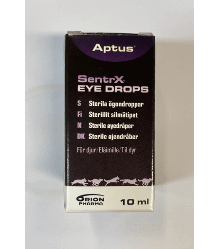 APTUS SENTRX ØYEDRÅPER 10mlØyedråper for hunder, katter og hester.Aptus SentrX øyedråper, tåresubstitutt, er et patent basert på kjemisk modifisert, krysslenket hyaluronsyre.Aptus SentrX tåresubstitutt gir en fuktbindende og smørende effekt.Oppbevares i romtemperatur og må ikke utsettes for frost.Åpnet pakning bør brukes innen 1 måned. ...