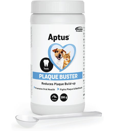Aptus Plaque Buster Tannpulver er tannpulver til hund og katt som bidrar til å opprettholde en god munnhygiene. Aptus Plaque Buster Tannpulver bidrar til bedre ånde og renere tenner innen 1-2 måneder etter bruk. Tannpulveret er enkelt å bruke og blandes inn i fôret. OBS! Inneholder naturlig høye nivåer av jod fra tang, derfor anbefales ikke produktet for dyr med skjoldbruskkjertelproblemer. ...