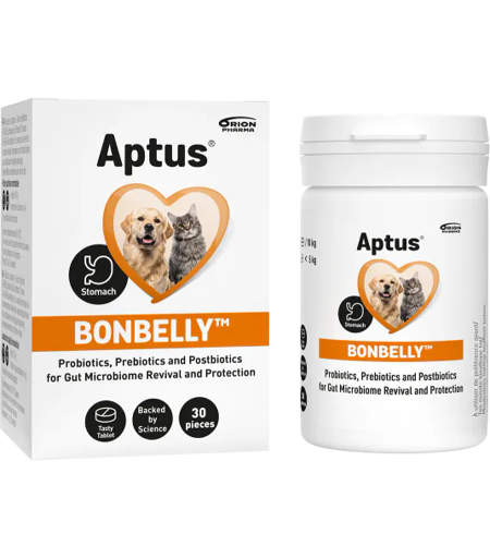 APTUS BONBELLY - 30stkTabletter for fordøyelsen med pre-, pro- og postbiotika til hund og katt.Egenskaper:Tabletter som kan bidra til å støtte tarmbalansen, fordøyelsen og immunsystemet til hund og katt. Inneholder pre-, pro- og postbiotika, vitaminer, elektrolytter og inaktivert gjær, som alle kan bidra til bedre tarmhelse og god fordøyelse. Kan gis ved fordøyelsesforstyrrelser som diaré, eller forebyggende ved bruk av antibiotika eller fôrbytte.Bruksanvisning:Kan gis som godbit eller blandes i fôret. 1 tablett daglig per 10 kg kroppsvekt. 1/2 tablett daglig for dyr ...