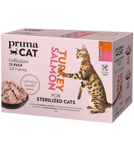 Våtfôr for steriliserte katter! PrimaCat har utviklet et våtfôr som er tilpasset steriliserte katter og deres unike behov. Katter som er sterilisert har ikke det samme energiforbruket som ikke-steriliserte katter. Derfor må de spise en bestemt diett med mindre kalorier. For hvem har vel sagt at maten må være kjedelig selv om man må tenke på kaloriene? PrimaCats våtfôr for steriliserte katter inneholder nydelig laks og kalkun i saus, kattens favoritt. Inneholder 50 % kjøtt og 50 % saus og ingen tilsatt sukker, og der alle råvarene kommer fra Europa. Våtfôret er kornfritt. Våtfôret er et komplett fôr og kan derfor gis som eneste fôr hvis man ønsker det. Forpakningen inneholder 12 stk. posjonsposer, se fôrinstruksjonen nedenfor. ...