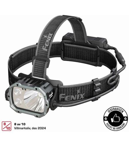 Fenix HP35R hodelykt - 4000 lumen. Stor og kraftig hodelykt med separat batteriboks og hele 4000 lumen. Test: 8 av 10 i Villmarksliv! Fenix HP35R er en allsidig og pålitelig hodelykt for de som trenger sterk belysning i tøffe miljøer. 8 av 10 i Villmarksliv 2024 Testet og godkjent av Jegeravisen 2024 Innebygd 5000mAh-batterier i batteriboksen gir ultralang driftstid på opptil 500 timer og kan lade andre digitale enheter. Man kan enkelt bytte mellom tre moduser og fire lysstyrkenivåer for hver modus ved hjelp av dreiebryteren og den elektroniske bryteren. Hodelykten har en kombinasjon av spotlight, flomlys og spot-og-flomlys, mens selve batteriboksen inkluderer et rødt lys for å varsle andre. Opptil 450 meters rekkevidde for belysningsbehov i søk og redning, leting og andre utendørs aktiviteter. IP66-klassifisert beskyttelse og 2 meter støtsikker. Vaskbart nylonhodebånd som er lett, ventilert og behagelig å ha på. Hodelykt og batteriboks har åpne fester som passer Fenix ALG-03 V2.0 hodelyktfeste og Fenix ALG-04 hjelmklemmer, med også et bredt utvalg hjelmtyper. Spesifikasjoner HP35R hodelykt: Vekt: 433 gram. Mål: 94,1 x 48,7 x 57,4 mm. Maksimal lysstyrke: 4000 lumen. Maksimal rekkevidde: 450 meter. Batteritid: Opptil 500 timer. Batteritype: 2 x 5000mAh integrert. Batterikapasitet medfølgende batteri (mAh) : 10.000mAh. Ladeport: USB-C. Vanntett: IP66. Støtsikker: 2 meter. ...