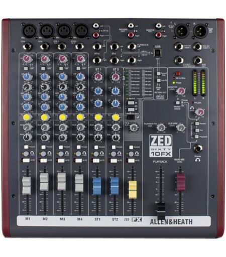 Allen and Heath ZED-60-10FX er en kompakt mikser for band eller solo artister som krever en ultra bærbar konfigurasjon for at de skal være klar på et øyeblikks varsel. ZED60-10FX bygger på den bestselgende ZED-10FX ved å legge til 60mm fadere for en mer behagelig og effektiv mixing. ...