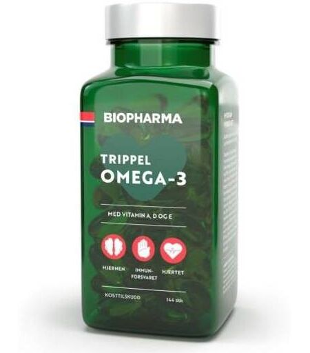 Biopharma Trippel Omega er et omega-3-tilskudd. Produktet inneholder omega-3 som inneholder omega-3-fettsyrene EPA og DHA, samt vitamin D, A og E.EPA og DHA bidrar til hjertets normale funksjon. Den gunstige virkningen oppnås ved et daglig inntak av 250 mg EPA og DHA. Anbefalt døgndose av Biopharma Trippel Omega-3 gir et inntak på 550 mg EPA og DHA. Vitamin D bidrar til å opprettholde et normalt immunforsvar. Anbefalt døgndose :2 kapsler. Innhold:144 kps ...