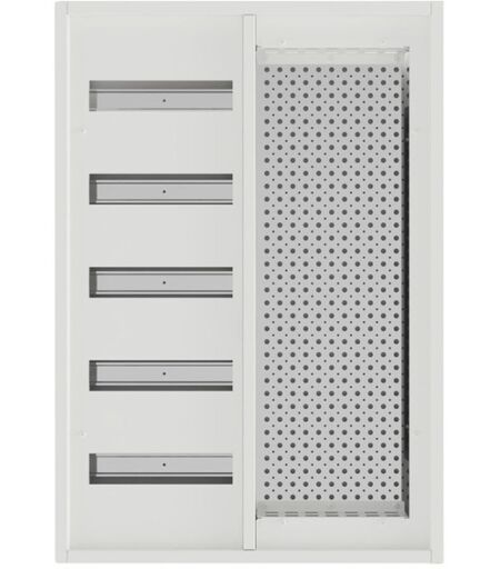 Fordelingsskap, side by side. 5 rader med plass til totalt 60 moduler. 5x12. Eget felt på siden til svakstrøm/EKOM hvor front og bakside er i plast. Med KEYSTONE patchepanel, samt utsparringer til schuko stikk (50x50). Bredde 55cm, dybde 10cm. Maks merkestrøm 2x63A, 3/4x63A. Utsparring til 3 stikk, plass til 2x14 stk Keystone. Vi er etter Forskrift om elektrisk utstyr § 21 pliktig til å informere våre forbrukere at installasjonsmateriell ment for å kunne inngå i et fast elektrisk anlegg kan kun installeres av en registrert installasjonsvirksomhet. Unntatt er elektrisk materiell som utelukkende er ment for bruk i faste teleinstallasjoner, og elektrisk materiell som forbruker selv lovlig kan installere. ...