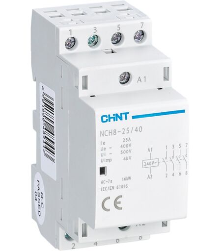 Modulærkontaktor 25A med 4NO hovedkontakter. Beregnet for AC1/AC7 drift. Se produktblad for belastningstabell. Vi er etter Forskrift om elektrisk utstyr § 21 pliktig til å informere våre forbrukere at installasjonsmateriell ment for å kunne inngå i et fast elektrisk anlegg kan kun installeres av en registrert installasjonsvirksomhet. Unntatt er elektrisk materiell som utelukkende er ment for bruk i faste teleinstallasjoner, og elektrisk materiell som forbruker selv lovlig kan installere. ...