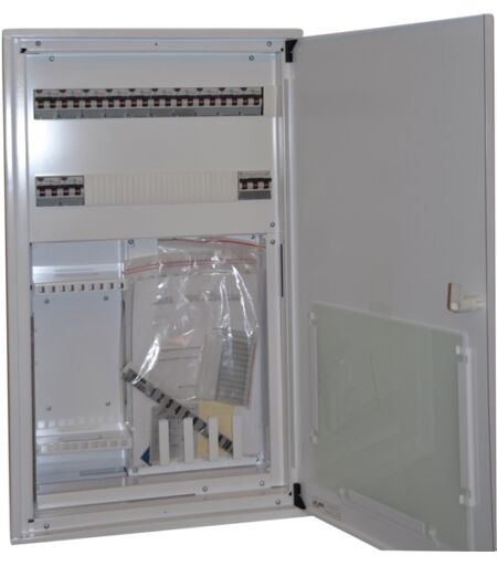Ferdigkoblet sikringskap med svakstrømsfelt 230V. Skaptype ESK-Modulskap 42 mod. Innehold Elnummer Type Antall 1623980 Overbelastningsvern S203-OV63A 3p ABB 1 1623990 Jordfeilautomat 2p C 25A 30mA DSH202C M Ck25 A30 ABB 1 1623988 Jordfeilautomat 2p C 16A 30mA DSH202C M Ck16 A30 ABB 6 1623986 Jordfeilautomat 2p C 10A 30mA DSH202C M Ck10 A30 ABB 5 1643267 Samleskinne stift S3/10 L1-L2-L3 10mm² 20 mod 1 1296302 Klemme isolert OTL 1x1,5-50mm² AL/CU Gul/Grønn 1 Vi er etter Forskrift om elektrisk utstyr § 21 pliktig til å informere våre forbrukere at installasjonsmateriell ment for å kunne inngå i et fast elektrisk anlegg kan kun installeres av en registrert installasjonsvirksomhet. Unntatt er elektrisk materiell som utelukkende er ment for bruk i faste teleinstallasjoner, og elektrisk materiell som forbruker selv lovlig kan installere. ...
