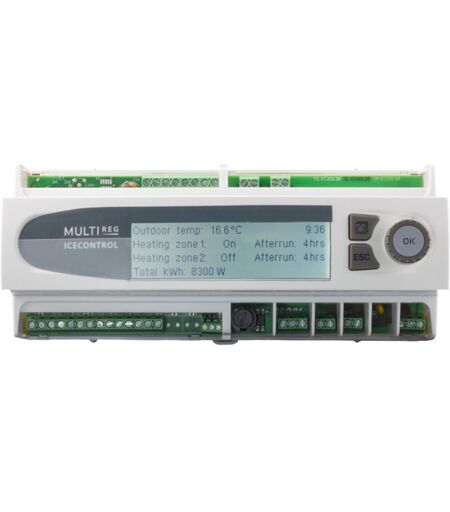 Multireg IceControl Pro er en styringsenhet for inntil to varmesoner. Den er utviklet for å smelte snø og is på bakken, i trapper og på tak og i takrenner. Multireg IceControl Pro er kompatibel med flere typer bakke- og luftfølere. Regulatoren kan brukes til både elektriske og vannbårne varmeanlegg. Vi er etter Forskrift om elektrisk utstyr § 21 pliktig til å informere våre forbrukere at installasjonsmateriell ment for å kunne inngå i et fast elektrisk anlegg kan kun installeres av en registrert installasjonsvirksomhet. Unntatt er elektrisk materiell som utelukkende er ment for bruk i faste teleinstallasjoner, og elektrisk materiell som forbruker selv lovlig kan installere. ...