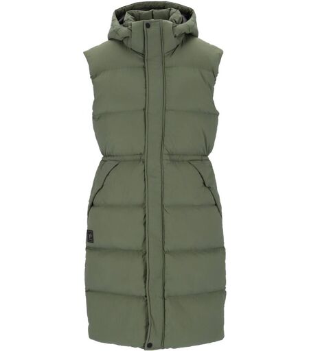 Twentyfour Eva Puffy Vest D er en lang og varm vest i et mykt, matt materiale. Vesten er fylt med et resirkulert fyll som er lett og isolerende. Vesten har fast hette, to-veis glidelås i front og sidelommer med trykknapper. Vann- og vindavstøtende SBS glidelåser Fast ...