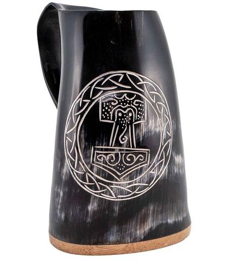 Mjød Kolleksjon – Mjødkrus laget av ekte horn! Motiv: Thors HammerSkål som en ekte viking med dette majestetiske drikkekruset, håndlaget av organisk dyrehorn og dekorert med et detaljert design av Thors Hammer – symbolet på styrke og beskyttelse i norrøn mytologi. Perfekt for å nyte mjød, øl eller annen vikinginspirert drikke under festlige lag.Dette kruset rommer 0,6–0,7 liter væske og har en høyde på ca. 16,5 cm og bredde på 10,5 cm. Hvert krus er unikt, med naturlige variasjoner i farge, form og størrelse, som reflekterer hornets naturlige karakter og gjør hvert stykke til et kunstverk.Mål: Vær oppmerksom på at dette hornproduktet er laget av organisk dyrehorn, og hvert produkt vil derfor være unikt! Det vil si at farge, form og størrelse vil variere noe.Mjød: 0,6-0,7 literHøyde: 16-17 cmBredde: 10-11 cm VedlikeholdFor at ditt hornprodukt skal forbli fint anbefaler vi at du har følgende ting i bakhodet:- Ingen varme drikker i hornproduktet- Kun håndvask med varmt såpevann og myk børste eller svamp- Skyll godt og tørk av med kjøkkenhåndkle etter vask- Ingen ekstreme temperaturerSkål i vikingenes ånd, og la drikken skumme som bølgene under et stolt vikingskip! ...