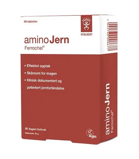Jern er en viktig del av hemoglobinet som gir blodet den røde fargen. Det er jernet som binder oksygen fra lungene, så de røde blodcellene kan frakte oksygenet vi puster inn rundt til kroppens celler. Jern inngår også i oppbyggingen av protein og i energiproduksjonen via en rekke ulike enzymer. Hvem trenger jerntilskudd?Undersøkelser har vist at så mange som hver fjerde kvinne i menstruerende alder kan ha jernmangel. Gravide og ammende har også lett for å få for lite jern. Forskning har vist at opptil 80 % av alle kvinner har jernmangel i siste del av svangerskapet. For gravide anbefales det derfor ofte å starte med AminoJern så tidlig i svangerskapet som mulig (jernlageret bør imidlertid først måles hos lege/jordmor). Andre deler av befolkningen som kan være utsatt for jernmangel, er barn som spiser lite og ungdom i vekst med dårlige kostvaner. Det samme gjelder voksne kvinner og menn som spiser lite eller går på lavkalori-diett. Symptomer på jernmangelFør du tar et jerntilskudd kan det uansett være fornuftig å be legen om å måle jernlageret (serum ferritin, som det kalles på fagspråket). Dette vil gi deg et helt sikkert svar på om du trenger ekstra tilskudd av jern. Symptomer på jernmangel kan være tretthet, svimmelhet, kvalme, kraftløshet og blek hud. Når kroppen forbruker mer jern enn den tilføres gjennom kosten, vil jernlageret gå tilbake og etter hvert tømmes helt. Først når jernlageret er i ferd med å tømmes, vil blodprosenten (hemoglobinverdien på fagspråket), begynne å synke. Jernmangel defineres som en tilstand der blodprosenten er normal, men hvor kroppens jernlager er i ferd med å tømmes. Blodmangel (jernmangelanemi på fagspråket) er derimot en tilstand der både kroppens jernlager er helt tomt, samtidig som blodprosenten er for lav. Hvordan virker AminoJern?I AminoJern finnes en spesiell jernforbindelse, Ferrochel, som er utviklet og patentert av Albion Laboratories Inc. i USA. I Ferrochel ligger jernmolekylet omgitt av to aminosyrer, en på hver side. De danner det som kalles for et dipeptid. Når du tar AminoJern, vil kroppen gjenkjenne dipeptidet. Det suges lett opp gjennom tarmveggen, og jernet får være med som gratispassasjer. Vel innenfor skiller de to aminosyrene lag, og vips: der ligger jernet klart til bruk! Du får en langt bedre utnyttelse av jernet og slipper trøbbel med magen. AminoJern absorberes faktisk opptil fire ganger bedre enn tradisjonelle jernpreparater. I vanlige jerntilskudd frigjøres jernet allerede i tarmen. Tarmen er imidlertid ikke så flink til å suge opp rent jern, og mye av jernet vil rett og slett havne i toalettet. Mens jernet driver rundt i tarmen kan det dessverre forårsake en del problemer. Et eksempel: Jern og sink er antagonister – det vil si at de hemmer opptaket av hverandre. Sink er viktig for immunforsvaret ditt, men det bryr ikke jernet seg om. Her er det ingen nåde. Sinken blir rett og slett dyttet bort, og resultatet kan være at sinkopptaket blir betydelig hemmet. Selen og kobber er andre... ...