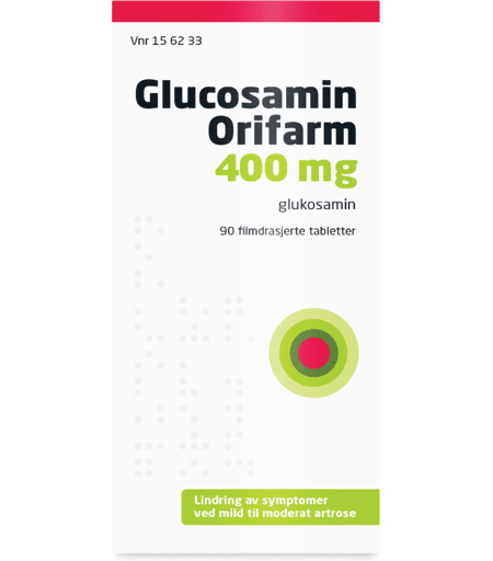Glucosamin Orifarm 400 mg tabletter er et reseptfritt legemiddel til lindring av symptomer ved mild til moderat artrose (slitasjegikt) hos voksne over 18 år. Glucosamin Orifarm 400 mg tabletter inneholder virkestoffet glukosamin. Glukosamin er et naturlig forekommende stoff i kroppen, som er dannet av glukose (en type sukker). Kroppen trenger glukosamin for å danne store molekyler som finnes i leddvæske og brusk. Lindring av symptomer (særlig smertelindring) inntrer vanligvis innen 4 uker etter behandlingens start. OBS! Virkestoffet fremstilles av skalldyr, så legemidlet må ikke brukes dersom du er allergisk mot skalldyr. Til voksne over 18 år. Les pakningsvedlegget nøye før bruk. ...