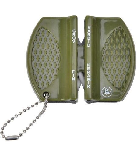 Brusletto knivsliper - enkelt og effektivt. En knivsliper/knivbryne som er svært enkel å bruke og som gir et godt resultat hver gang. Dette er et bryne som er egnet til kniver som begynner å bli sløve, ikke knivegger som er helt nedslitt/hakkete. På den ene side er det tungstenkarbid som brukes til grovsliping. Snu knivsliperen rundt og det er keramiske slipestener på den andre siden for finsliping. Ta noen få drag med kniven uten å legge for mye press på bladet - først på tungstenkarbid-siden og så noen drag over de keramiske slipestenene og du har en skarp og fin egg. Anti-skli belegg på kantene og rillet grepsflate gjør den stabil og sikker i bruk. Kompakte mål (6 x 7 cm) og lav vekt (38 gram) gjør den til et ypperlig produkt å ha med "ut i felten". ...