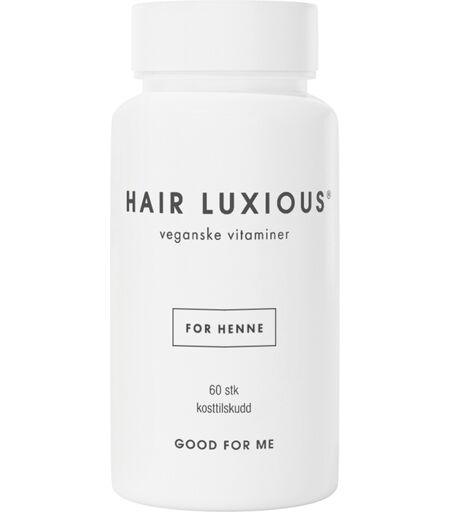 Good For Me Hair Luxious for henne er et kosttilskudd med vitaminer og mineraler som bidrar til å opprettholde normal hårvekst. Good For Me Hair Luxious for henne er et vegansk mineral- og vitamintilskudd for kvinner som ønsker lengre og tykkere hår. Tilskuddet inneholder 24 nøye utvalgte vitaminer, mineraler og ekstrakter som på hver sin måte bidrar til å opprettholde normal hårvekst og gi hår, hårrøtter og hodebunn næring innenfra. Ved regelmessig bruk over tid vil produktets innhold av biotin (vitamin B7/B8) bidra til å opprettholde normalt hår, og niacin (vitamin B3) og riboflavin (vitamin B2) bidra til å opprettholde normal hud. Hair Luxious inneholder også kobber for normal hårpigmentering og sink som bidrar til å beskytte cellene mot oksidativt stress. Hair Luxious gir håret ditt alt det trenger av næring for å vokse. Til voksne og unge over 11 år. Inneholder ikke gelatin, laktose, sitrus, gluten eller animalske ingredienser. NB! Tidligere tilsetningsstoff som gjorde tablettene hvite, er nå tatt ut. Tablettene er nå derfor brune i fargen. ...