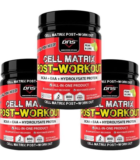 Post-Workout All-in-One produkt med BCAA, EAA, Hydro Protein og OpticarbKjøp 3-pack Cell Matrix Post Workout til kun 999,- Cell Matrix Post Workout har det du trenger etter trening i en scoop!Nydelig smak, 100% smaksgaranti, fornøydgaranti!Produktinformasjon:Cell Matrix Post-Workout er en raskt oppløselig drikk, designet for å konsumeres umiddelbart etter trening. Denne avanserte formelen kombinerer BCAA, EAA, hydrolysert Peptopro-protein og Opicarb-karbohydrater for å optimalisere restitusjonen. Ved å tilføre kroppen essensielle næringsstoffer etter anstrengende økter, bidrar Cell Matrix til å redusere muskelnedbrytning, styrke immunforsvaret og fremskynde reparasjonsprosessen. Dette er avgjørende for både toppidrettsutøvere og de som ønsker å maksimere resultatene av treningen.Fordeler ved bruk av Cell Matrix Post-Workout:- 100% smaksgaranti! Nydelig smak!- All-in-One produkt, perfekt etter trening!- Perfekt blanding av BCAA, EAA, Hydro Protein og Opticarb- Aktiverer anabol effekt (muskeloppbyggende) - Kan bidra til raskere reparasjon av muskelceller og raskere restitusjon!- Perfekt å drikke etter trening!Brukerveiledning:Bland 1 scoop (50g) med 400-500 ml vann, rist godt og drikk umiddelbart etter trening.Innhold per pakke:3 bokser à 800 gramSmak:Pære/limeInnholdsfortegnelse: NæringsinnholdPer 100 gEnergi1521 kJ / 364 kcalFett0 gKarbohydrater 56 g- Hvorav sukkerarter16 gProtein35 gSalt1,5 g InnholdPer servering (50 g)BCAA 8:1:16000 mgL-Leucin4800 mgL-Valin600 mgL-Isoleucin600 mgEAA+ L-Lysin2000 mgL-Metionin250 mgL-Treonin300 mgL-Fenylalanin500 mgL-Alanin2000 mgGlycin2000 mgPEPTOPRO5000 mgUltra hydrolisert kasein (di, tri-peptider) Opticarb Dextrose monohydrat8000 mg (8 g)Glukose polymer20 000 mg (20 g)Resorption Natrium (klorid)300 mg)Kalium (klorid)300 mgMagnesium (citrat)200 mgKalsium (citrat)100 mgIngredienser: BCAA 8:1:1 (L-leucin, l-valin, l-isoleucin), EAA+ (L-lysin, l-metionin, l-treonin, l-fenylalanin, l-alanin, glycin), Peptopro (melk) (Ultra hydrolisert kasein (di, tri-peptider)), otpicarb (Dextrose monohydrat, flukose polymer), resorption (natrium (klorid), kalium (klorid), magnesium (citrat), kalsium (citrat)).Må ikke brukes hvis lokk eller sikkerhetssegl er brutt/mangler. Dette kosttilskuddet skal kun brukes av voksne. Anbefalt dosering bør ikke overskrides. Oppbevares på en tørr, mørk og kjølig plass utilgjengelig for barn. Bør ikke utsettes for direkte sollys. Skal ikke brukes av barn og unge under 18 år. Ikke beregnet for kvinner som er gravide eller ammende. Rådfør deg med legen din før bruk av dette produkter hvis du bruker medisiner eller har en medisinsk tilstand. Kosttilskudd bør ikke brukes som en erstatning for et variert kosthold. ...