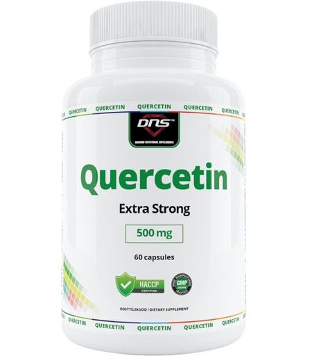 Kraftig dosert Quercetin med hele 2 mnd forbruk per boks!DNS Quercetin er kraftig dosert med hele 500 mg per kapsel. Dette naturlige antioksidantet bidrar til å styrke kroppens forsvarssystem og opprettholde et robust immunforsvar. Quercetin finnes naturlig i blant annet løk, epler, grønn te og andre planter.Kjøp 3-pack Quercetin til kun 999,- Klikk her og spar penger! BESTILL 3-PACK HERQuercetin har en rekke andre potensielle helsefordeler og er blant annet kjent for å være en naturlig antihistamin, noe som gjør at den kan lindre symptoner på pollenallergi og andre allergiske reaksjoner. Dette naturlige flavonoidet kan også ha positiv effekt for hjerte- og karsykdommer ved å senke blodtrykk ettersom det forbedrer blodårenes funksjon.Quercetin Extra Strong:- Hele 500 mg Quercetin per kapsel!- Hjelper mot lette allergiplager- Styrker immunforsvaret- Kraftig naturlig antioksidant- Fungerer som en antihistamin- Veganske kapslerInnhold per boks:60 veganske kapslerAnbefalt dosering:1 kapsel per dag sammen med mat.Næringsinnhold:InnholdPer servering (1 kapsel)Quercetin 500mgIngredienser: Quercetin (Sophora japonica ekstrakt); kapselskall: hydroksypropylmetylcellulose; bulkmiddel: dikalsiumfosfat; antiklumpemiddel: magnesiumstearat, silisiumdioksid.Må ikke brukes hvis lokk eller sikkerhetssegl er brutt/mangler. Dette kosttilskuddet skal kun brukes av voksne. Rådfør deg med legen din før bruk av dette produkter hvis du er gravid, ammer, bruker medisiner eller har en medisinsk tilstand. Anbefalt dosering bør ikke overskrides. Oppbevares på en tørr, mørk og kjølig plass utilgjengelig for barn. Bør ikke utsettes for direkte sollys. Ikke beregnet for barn under 18 år, kvinner som er gravide eller ammende. Kosttilskudd bør ikke brukes som en erstatning for et variert kosthold. ...