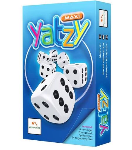 Norges mest populære terningspill. MaxiYatzy spilles akkurat som vanlig Yatzy, men her spilles det med 6 terninger, og flere kombinasjons-muligheter. Klarer noen å få 6 like? MAXI YATZY!Kommer i pappeske som på bildet til oppbevaring. ...