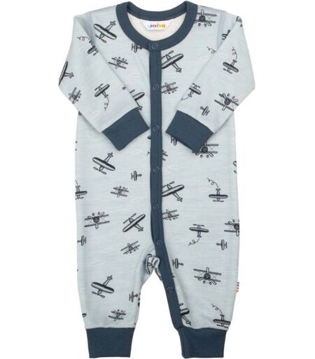 Joha Goose/Propeller heldress/pyjamas ull/bambusMyk og elastisk heldrakt med søtt print og kontrastfargede kanter. Lukkes med knapper foran og ned gjennom det ene benet for enkel påkledning. Ullen ligger ytterst for varme, mens innsiden er i myk økologisk bambus – skånsom mot selv den mest sensitive ...
