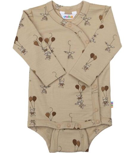 Joha Balloon Bunny omslagsbody i ullMyk og lett omslagsbody til de minste, laget av ekstra fin merinoull som føles behagelig mot huden. Trykknapper skrått over magen og mellom bena gjør den enkel å ta av og på. Søtt print og Oeko-Tex® 100-sertifisert.Materiale: 100 % merinoull ...