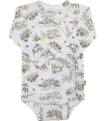 Joha Nature Park omslagsbody i ull/silkeLangermet body med praktisk sidelukking for de minste. Trykknapper skrått over magen og mellom bena gjør påkledningen enklere. Laget i en ekstra fin ullkvalitet med silke – utrolig myk mot huden og med et lett skinnende uttrykk for et eksklusivt preg. Med søtt ...