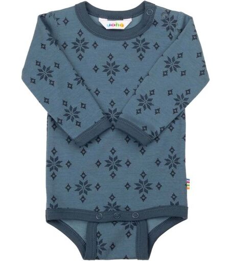 Joha Ice Crystals body i ull/bomullLangermet body med smale ribkanter, trykknapper ved skulder og mellom bena for enkel påkledning. Ullen ligger ytterst for varme, mens innsiden er i myk økologisk bomull – skånsom mot sensitiv hud. Søtt print med kontrastfargede kanter. Oeko-Tex® ...