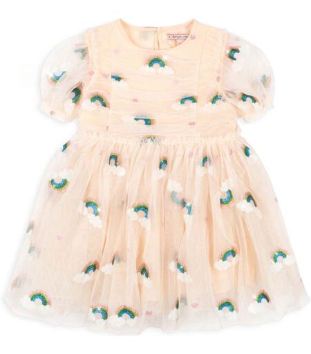 Konges Sløjd Tullie kjole til baby og barnEn festlig kjole med puffede ermer, rynket overdel i transparent tyll med broderte regnbuer og et voluminøst skjørt som gir et lekent uttrykk. Fôret med myk bomull for ekstra komfort – perfekt til spesielle anledninger.Materiale: 100% polyester / Fôr: 100% ...